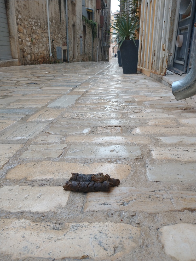 Već godinama ulica Vladimira Gortana služi kao glavni javni toalet za kućne ljubimce čiji ih vlasnici dovode u "šetnju" kako bi obavili nuždu. To se posebno događa noću kada vlasnici pasa misle da ih nitko ne vidi, ali iza njih ostaje nepokupljen izmet njihovih ljubimaca. Ako vlasnici pasa za njih kupuju raznu odjeću, predlažem nadležnim službama našega grada da uvedu zakon kojim bi obvezivali vlasnike da svojim ljubimcima kupuju i pelene, kako se cijeli naš grad Rovinj - Rovigno ne bi pretvorio u javni pasji toalet. Moram naglasiti da iznimno volim životinje i vjerujem da bi trebale sretno živjeti u svom prirodnom okruženju.
